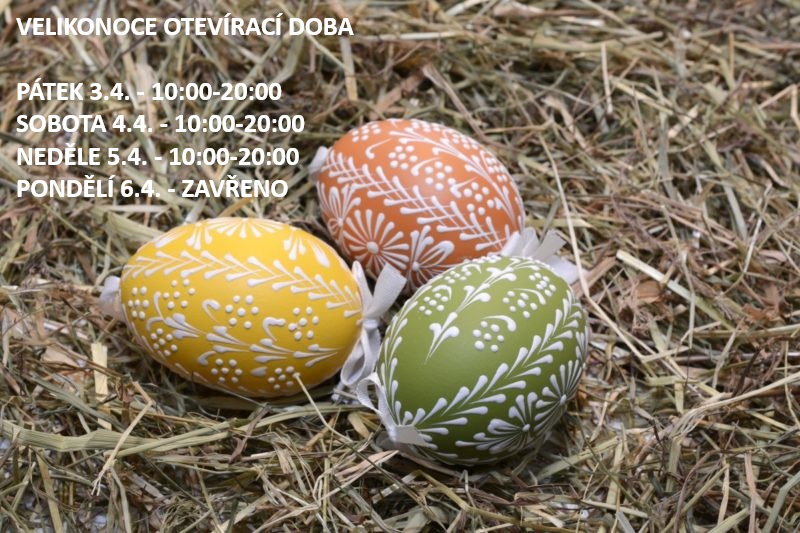 Na Velikonoční svátky máme otevřeno pátek 3.4. až neděle 5.4. tradičně od 10:00 do 20:00, v pondělí 6.4. máme ZAVŘENO. V pondělí můžete objednávat na partnerském e-shopu boardstar.cz :)